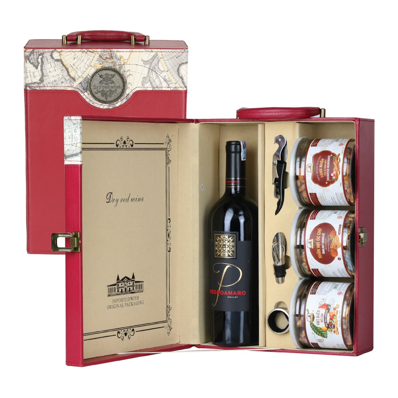 Vang Ý P Nnegroamaro Puglia Hạnh nhân rang mộc Mỹ 300g Nhân hạt óc chó Mỹ 200g Hạt điều vỏ lụa 250g Hộp da bản đồ đỏ Size L