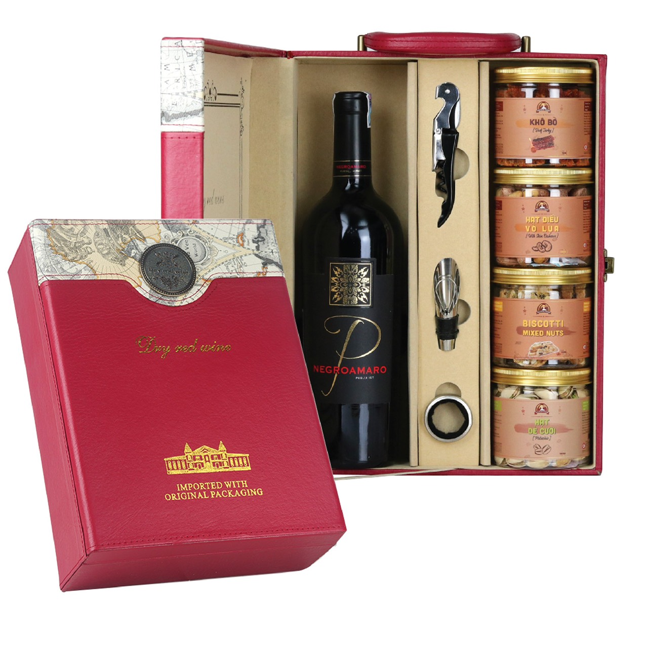 Vang Ý P Nnegroamaro Puglia Biscotti Mixed Nuts 180g Hạt dẻ cười Mỹ 180g Khô bò lát 135g Hạt điều vỏ lụa 180g Hộp da bản đồ đỏ Size L